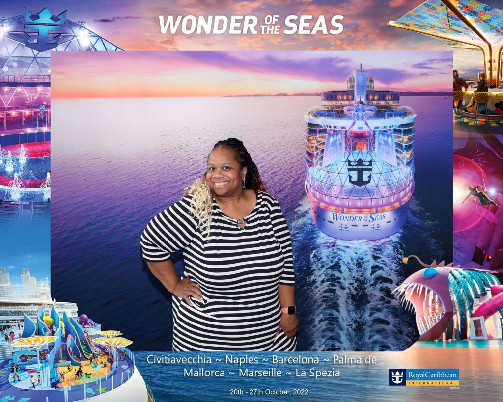 As we approached the ship, we paused for a photo opportunity. The colorful backdrop featuring the ship, I could not resist the urge to take a few pictures. The photographer asked for my room number when we were done taking pictures. And then, the moment I had been waiting for and relentlessly counting down the days until had arrived. As we approached the final ramp, I asked my escort to stop pushing me. It was time to partake in a cherished tradition that never failed to send shivers down my spine – walking onto the ship. With a deep breath, I rose from my seat, my feet meeting the solid ground. That first step, and the ones that followed, felt like I was stepping into paradise itself. And with that, I was on the ship! The adventure, my escape, my eagerly anticipated getaway, had truly, finally begun.