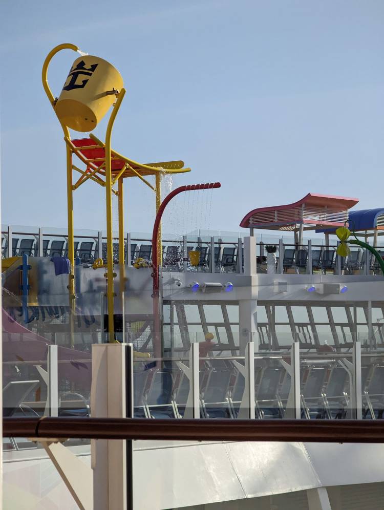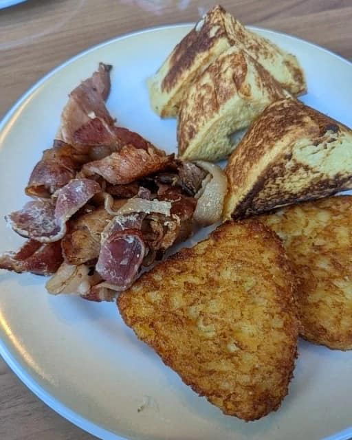 The Windjammer is not crowded, a pleasant change of pace from the usual crowds. I wash my hands and find a table. A friendly young man offers to grab my food. Royal Caribbean always goes above and beyond for passengers with disabilities. I order French toast, bacon, hash browns (RC’s potato dishes are LEGENDARY), chocolate milk, and water. My server and I chat for a bit—I love connecting with the amazing staff.