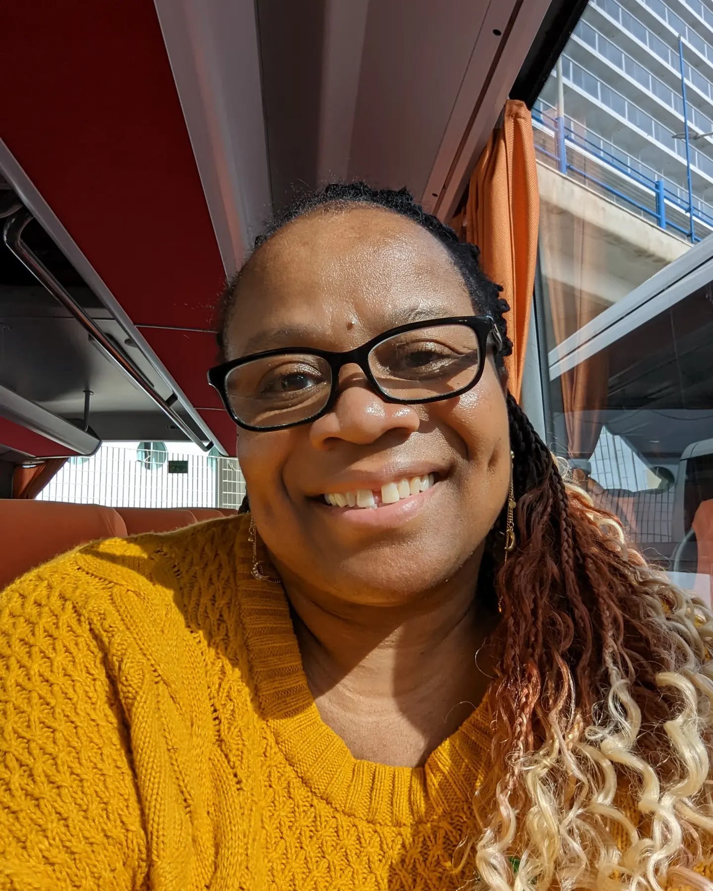 Before boarding the bus, I snap some pictures of the stunning port. There is something familiar about it, like I have been here before on a previous cruise. But as I gaze up at the hills, I realize this is uncharted territory. The tour operator lifts me and my scooter onto the bus, then locks in my scooter as I take a seat by the window—I am the first one on the bus again! I take a selfie and post it to Facebook, letting my family know I am the first one on the bus. My family will get the reference.