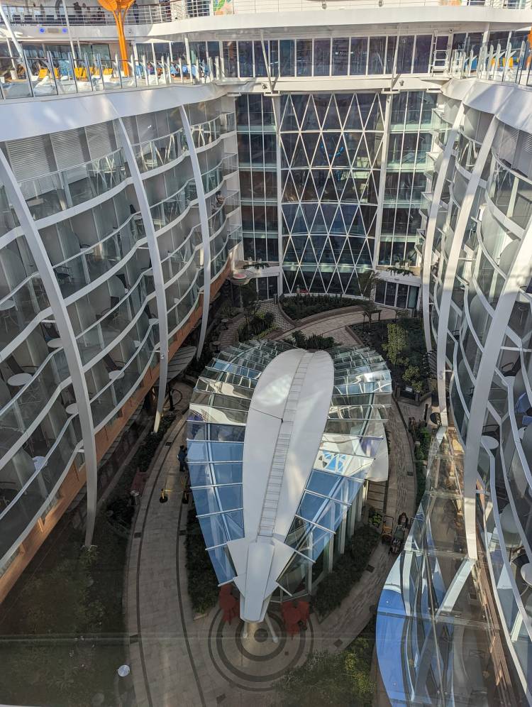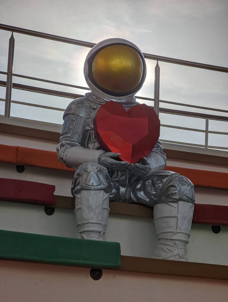After breakfast, I have some time to kill before my 1:30 excursion. I decide to play ship detective and track down the remaining two astronauts (there are three on board—I found the first last night!). I take a picture of the stunning views of Central Park from deck fifteen and then head out on deck to take more pictures. As I am taking pictures of the pool area, I spot the second astronaut. Aha! Astronaut number two is chillin’ on the bleachers with a heart in its lap. I take a few more pictures and make my way to the elevator. I get on and press the button for deck six, then roll to the back of the ship by the aqua theatre and spot the third astronaut hanging on the rock-climbing wall. Mission accomplished!