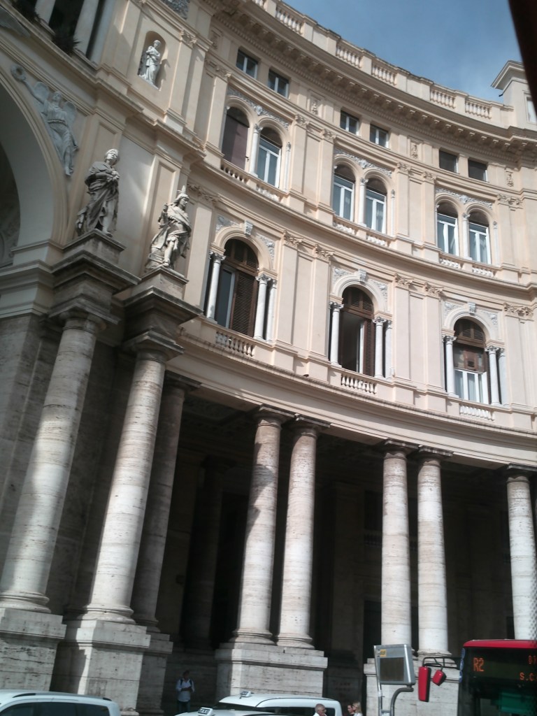 The monument of Obelisco di Portsalvo comes into view, and we keep rolling past a parade of buildings, monuments, and fountains that leave me awestruck. As we make our way through the shopping district, I feel like I could be in any American city as I look at the different designer stores. The bus continues through the streets, and then up a steep incline, it slows as it reaches the top. And then we stop. Our first stop of the day has arrived. We have a quick 10 minutes to jump out, take pictures, and take in the view. I leave my scooter behind and carefully make my way down the steps, taking in the sights.