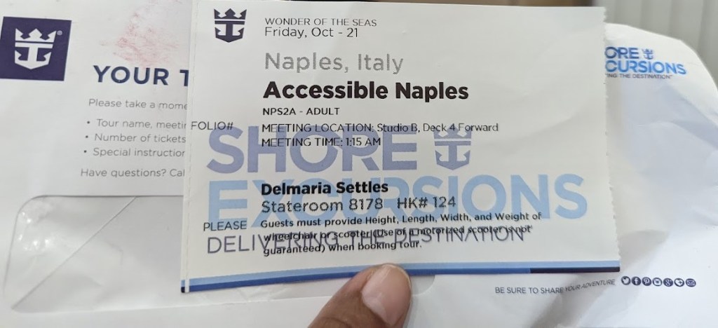 Accessible Adventures in Naples is the excursion I booked through Royal Caribbean; this tour is specifically designed for travelers with disabilities. There is usually one accessible excursion per port. Some ports do not offer accessible shore excursions, so I booked this one before my trip (I recommend doing this for all excursions).