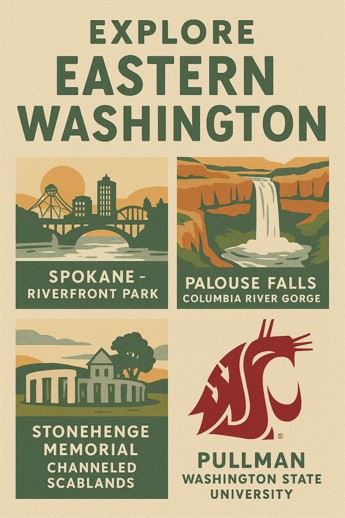 Eastern Washington is a world apart from the coastal side—think wide open spaces, rolling wheat fields, and sunny weather most of the year. Spokane anchors the region with its gorgeous Riverfront Park and lively arts scene. Outdoor lovers should check out the Columbia River Gorge, Palouse Falls (a real jaw-dropper), and the unique landscapes of the Channeled Scablands. You’ll also find hidden gems like the Stonehenge Memorial in Goldendale, scenic drives, and the college town of Pullman—home to Washington State University and some great restaurants. This side of the state is perfect for road trips, wine tasting, and stargazing in the wide-open night sky (Expedia, Frommers, State of WA Tourism).