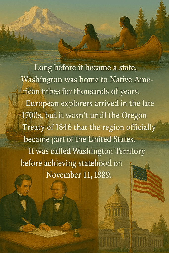 Long before it became a state, Washington was home to Native American tribes for thousands of years. European explorers arrived in the late 1700s, but it wasn’t until the Oregon Treaty of 1846 that the region officially became part of the United States. It was called Washington Territory before achieving statehood on November 11, 1889, making it the 42nd state in the Union. The state’s economy grew on logging, fishing, and farming, and the early 20th century saw the rise of powerful labor movements, especially in mining and logging communities (Wikipedia, Infoplease).