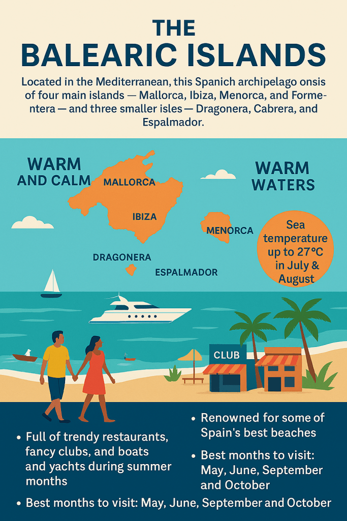 Nestled in the Mediterranean Sea, the Balearic Islands—Mallorca, Ibiza, Menorca, and Formentera—are beloved for their warm waters, white-sand beaches, and vibrant social scene. These islands are perfect for travelers seeking relaxation, culture, and a splash of glamour.
