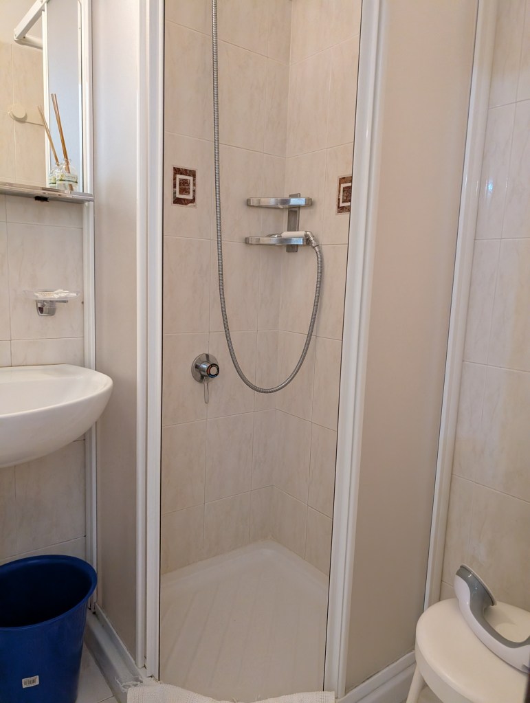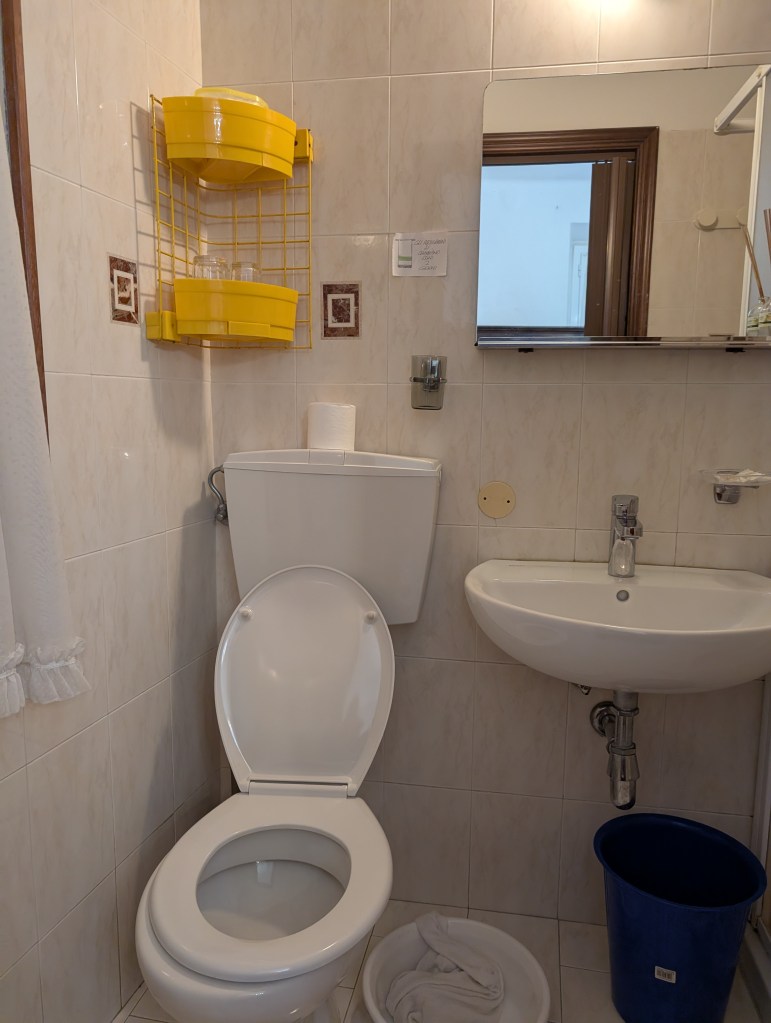 I did not have my scooter on this leg of the trip; Francesco had rented an SUV to make transfers easier, and he and Juliana helped me up and down the stairs. The room itself was nice and spacious (a queen and a single bed), though the bathroom also required a step up to enter.