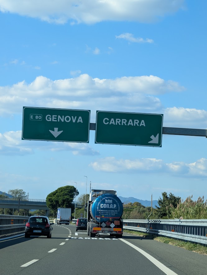 We drove toward Pisa, but it was on the way back that Francesco decided to detour to Carrara to show me Marble Mountain. The original plan dissolved, replaced by a sudden opportunity to see something truly unique. While driving around Carrara, we came to a massive processing plant for the famous marble. We saw a mound of marble rocks lying on the ground—pieces that didn’t make the cut (no pun intended!).